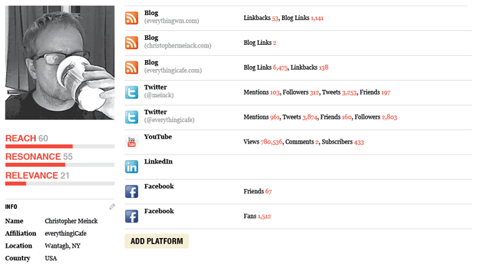 When it’s had a few days to do so, it will give you an updated list of influencers based not simply on how active they are on Twitter or Facebook, but on how much they use those terms in as many of their digital properties as they’ve been able to identify. If you find that the Traackr database is missing one or more of their digital properties can add a property and once Traackr verifies it, it will be added to that influencer’s profile.