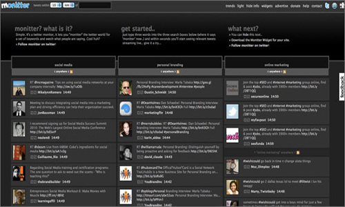 6 Monniter is a free real-time Twitter search and monitoring tool. It allows you to narrow your search by geolocation, to set up multiple queries and to see them side by side. Plus, you can pause the monitoring of each column. Saved searches aren’t part of its options since you don’t have to sign up to use it. You can, however, place a keyword-tracking widget on your website